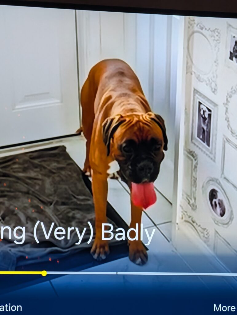 When they came back in, Dre was standing panting at the end of the hall, a very pink tongue, extreme tension around the eyes and forehead and he looked absolutely exhausted, but Graeme was pleased. See the photo below (apologies for the quality – its a shot of the tv as I was watching it!):